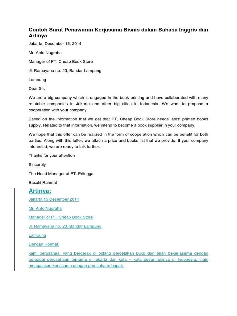 Contoh Surat Penawaran Kerjasama Bisnis Dalam Bahasa Inggris Dan Artinya Docx