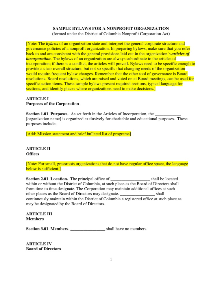 Sample Bylaws Dc Non Membership With Instructions Committee Board Of Directors