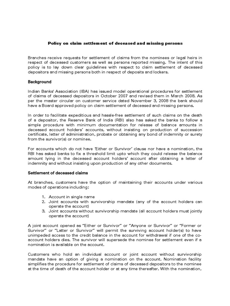 Policy For Settlement Of Claims In Respect Of Deceased Account Holders Pdf Free Download